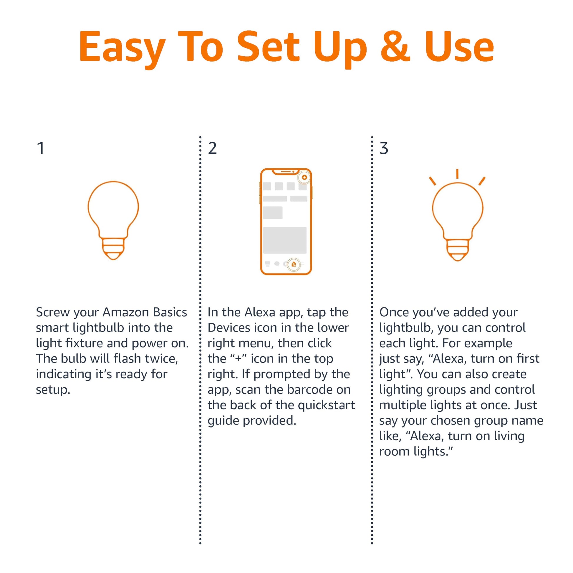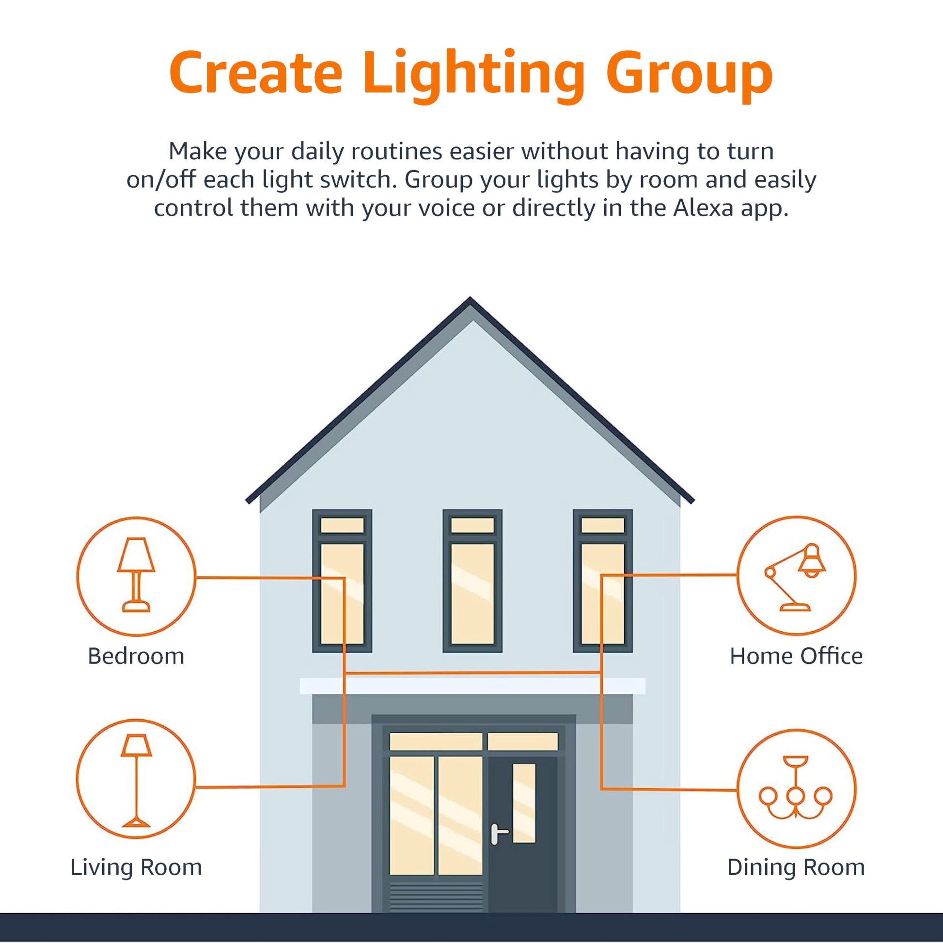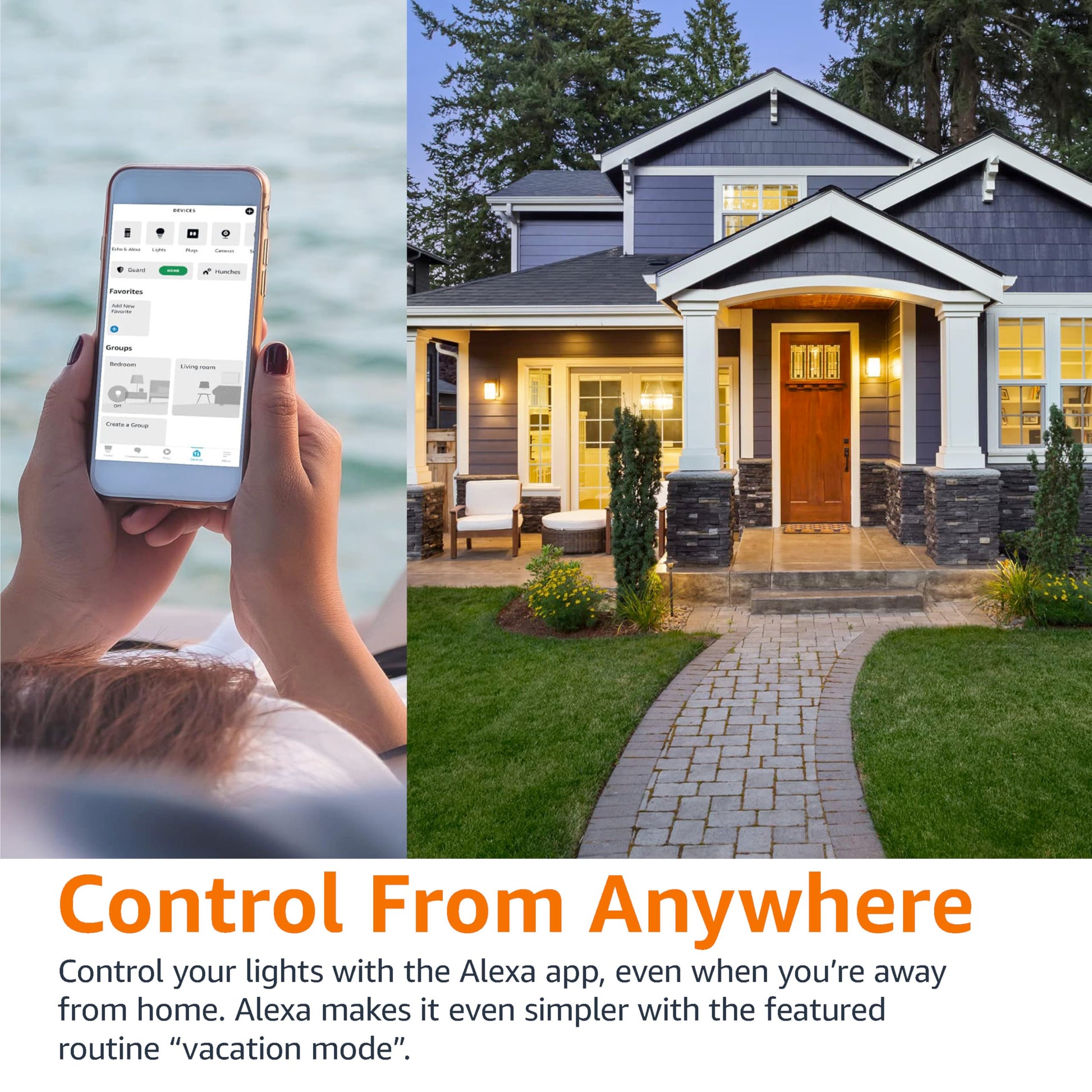 Control your lights with voice commands or the Alexa app—no more flipping switches. Dim brightness from 5% to 100% to match your mood and time of day. Manage your lights from anywhere, even when away from home, and create routines to turn lights on and off automatically at sunset and sunrise. Works with Alexa only. Dimmable via app or voice control (not compatible with physical dimmer switches). Perfect for any room, including bathrooms.