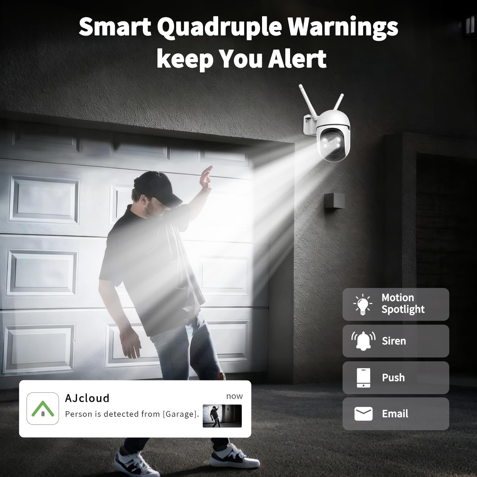 4MP Solar Wireless Outdoor Security Camera System with PTZ – 4 Pack 128GB local storage keeps all recordings encrypted and secure with no monthly fees or subscriptions. Up to 3 months of loop recording ensures your data stays protected even if a camera is damaged. Crystal-clear 4MP video with enhanced color night vision up to 65 feet. Control cameras remotely with pan, tilt, and zoom via app, or use Alexa voice commands for hands-free viewing. Completely wire-free with 5W solar panel and 8000mAh battery for year-round operation—no manual charging needed. Dual-band Wi-Fi (2.4G/5G) provides stable, fast connectivity. IP66 weatherproof rating handles heavy rain, snow, and extreme temperatures. Advanced AI human detection sends instant alerts and triggers two-way audio so you can communicate with visitors or deter intruders from anywhere. Adjustable sensitivity (16-29 ft range) reduces false alarms. Quick setup—cameras pair automatically when powered on. Connect the hub to your router via Wi-Fi or Ethernet and you're ready to monitor your entire property.